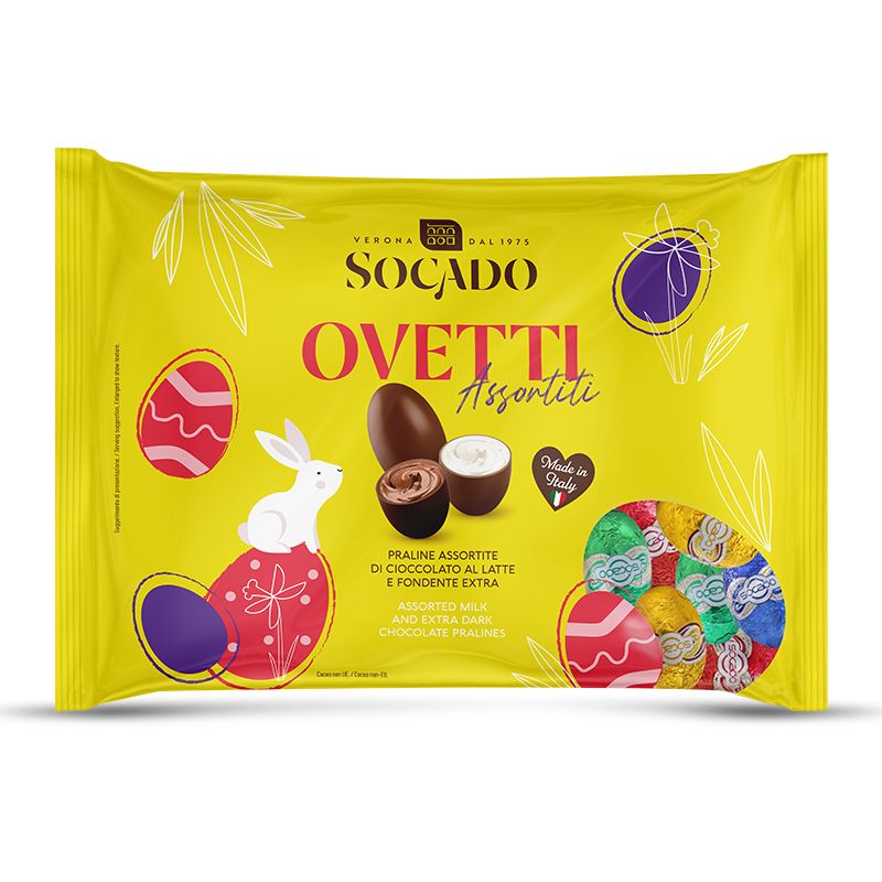 НАЙ-ВКУСНИТЕ ИТАЛИАНСКИ ШОКОЛАДОВИ БОНБОНИ ПОД ФОРМАТА НА ЯЙЦА - OVETTI ASORTI", С ФИН МЛЕЧЕН ШОКОЛАД,С БЯЛ ШОКОЛАД И С ЧЕРЕН ШОКОЛАД - РАЗЛИЧНИ ВИДОВЕ, МНОГО ПРИЯТНИ НА ВКУС, ГОЛЯМ ПАКЕТ 500 ГР