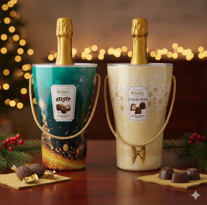 ПРАЗНИЧНА ШАМПАНИЕРА С ШОКОЛАДОВИ БОНБОНИ УИТОРС КРИСПИ 150 ГР И БУТИЛКА ДЕСЕРТНО ПЕНЛИВО БЯЛО ВИНО 750 МЛ / СИНЯ /