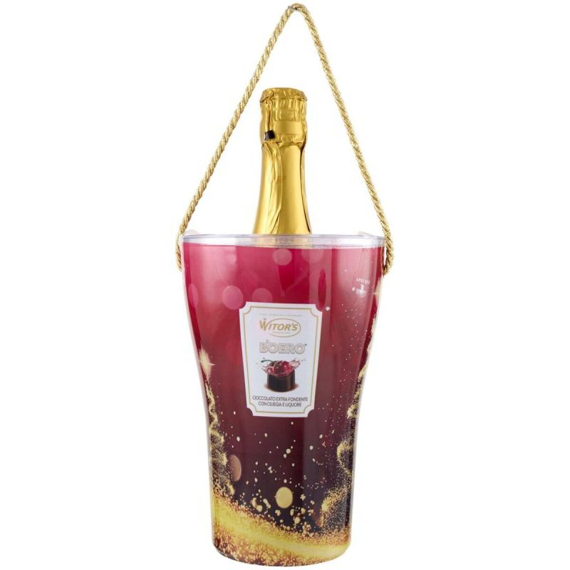 ПРАЗНИЧНА ШАМПАНИЕРА С ШОКОЛАДОВИ БОНБОНИ УИТОРС ПИЯНА ВИШНА 150 ГР И БУТИЛКА ДЕСЕРТНО ПЕНЛИВО БЯЛО ВИНО 750 МЛ / РОЗОВА /