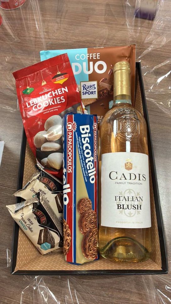УНИКАЛНА И МНОГО КРАСИВИВА ПОДАРЪЧНА КОШНИЦА С БУТИЛКА ИТАЛИАНСКО ВИНО РОЗЕ И ЛАКОМСТВА КАТО: ШОКОЛАД РИТЪР СПОРТ ДУО 216ГР, НЕМСКИ ГЛАЗИРАНИ БИСКВИТИ 200 ГР, СЛЕПЕНИ БИСКВИТИ С ШОКОЛАД ПАПАДОПОЛУС, СУХА ПАСТА БЕЙЛИС 2 БР , РАЗМЕР НА КОШНИЦАТА: 35 Х 20 СМ