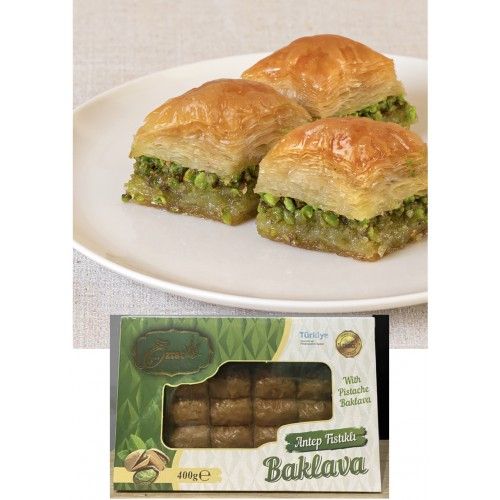 НАЙ-ВКУСНАТА ТУРСКА БАКЛАВА С ПИСТАЧИО - ШАМ ФЪСТЪК, ПРИГОТВЕНА СТАРАТЕЛНО ОТ МАСТЪР ГОТВАЧИ ПО СПЕЦИАЛНА РЕЦЕПТА "OZTAT", В КУТИЯ, 400 ГР