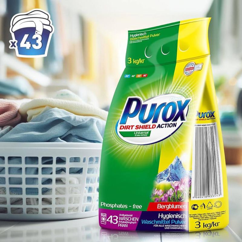 МНОГО СИЛНО АРОМАТЕН УНИВЕРСАЛЕН СУХ ПРАХ НА ПРАХ "ПУРОКС", ПЕРИЛНИЯ ПРЕПАРАТ, КОЙТО УХАЕ ЦЕЛИЯ СКЛАД ОТ НЕГО, ПОДХОДЯЩ КАКТО ЗА БЕЛИ - ТАКА И ЗА ЦВЕТНИ ДРЕХИ , СВЕЖ И ДЪЛГОТРАЕН АРОМАТ, 3 КГ, ЗА 43 ПЕРАЛНИ