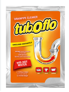 ТУБОФЛО САШЕ ЗА ОТПУШВАНЕ НА КАНАЛИ ЗА ГОРЕЩА ВОДА, ОТПУШВА НЕЗАБАВНО, НЕ УВРЕЖДА ПЛАСТМАСОВИ И МЕТАЛНИ ТРЪБИ! ИЗСИПЕТЕ САШЕТО И ЗАЛЕЙТЕ С 2Л ГОРЕЩА ВОДА, ИЗБЯГВАЙТЕ ВДИШВАНЕТО!