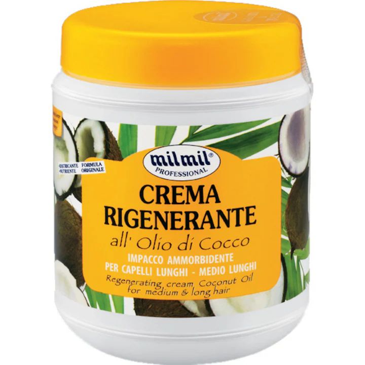 РЕГЕНЕРИРАЩА МАСКА С АРОМАТ НА КОКОС “МИЛ - МИЛ” МНОГО ПОДХОДЯЩА ЗА ИЗТОЩЕНИ КОСИ, 1000 ГР, С ТАЗИ МАСКА ЩЕ СЪЖИВИТЕ КОСАТА СИ, ЩЕ И ПРЕДАДЕТЕ БЛЯСЪК, П.С. Маската е с отмиване. Нанасясе на влажна чиста коса по дължина. Отмивате след 4-5 минути
