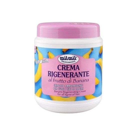 РЕГЕНЕРИРАЩА МАСКА С АРОМАТ НА БАНАН “МИЛ - МИЛ” МНОГО ПОДХОДЯЩА ЗА ИЗТОЩЕНИ КОСИ, 1000 ГР, С ТАЗИ МАСКА ЩЕ СЪЖИВИТЕ КОСАТА СИ, ЩЕ И ПРЕДАДЕТЕ БЛЯСЪК, П.С. Маската е с отмиване. Нанасясе на влажна чиста коса по дължина. Отмивате след 4-5 минути